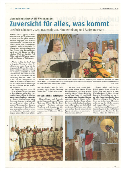 Im Kloster Waldsassen wurde am vergangenen Sonntag ein großes Fest gefeiert. Denn die Zisterzienserinnen begingen gleich drei Jubiläen auf einmal: Vor 160 Jahren wurde das Frauenkloster gegründet und die schulische Erziehung von Mädchen gestartet. Vor 100 Jahren wurde das Priorat des Frauenklosters zur Abtei erhoben. Und M. Laetitia Fech OCist ist seit 30 Jahren Äbtissin in Waldsassen.