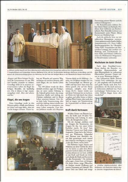 Das Interview mit der Äbtissin Laetitia Fech OCist ist im Rahmen der Serie "Werte und Wirtschaft" ist nun am vergangenen Mittwoch in der Gesamtausgabe der "Frankenpost" veröffentlicht worden
