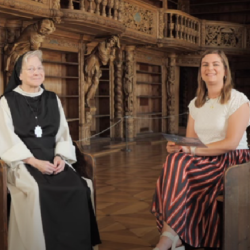 Moderatorin Nina Vilsmeier des Bitum Regensburg im Gespräch mit Äbtissin Laetitia Fech.