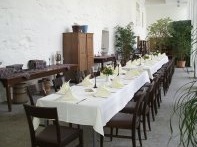 Zuerst ging es in den Kräutergarten der Umweltstation. Petra Stark stellte dort die wichtigsten Heil- und Speisekräuter vor. Dabei ging sie speziell auf die Kräuter ein, die für das anschließende Kräuterbüfett verwendet wurden. In der Lobby des Hauses St. Joseph war zwischenzeitlich für die "Pencoedler" eine riesige Tafel gedeckt worden und ein einzigartiges Menü vorbereitet.