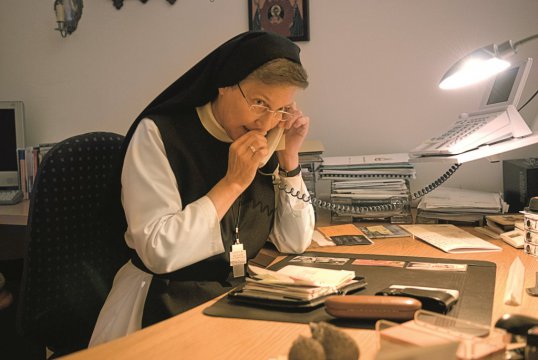 Szene spielt Äbtissin Laetitia und hält mit einem roten Telefon direkte Verbindung und Zwiesprache mit ihrem finanziellen Nothelfer, den Heiligen Joseph.